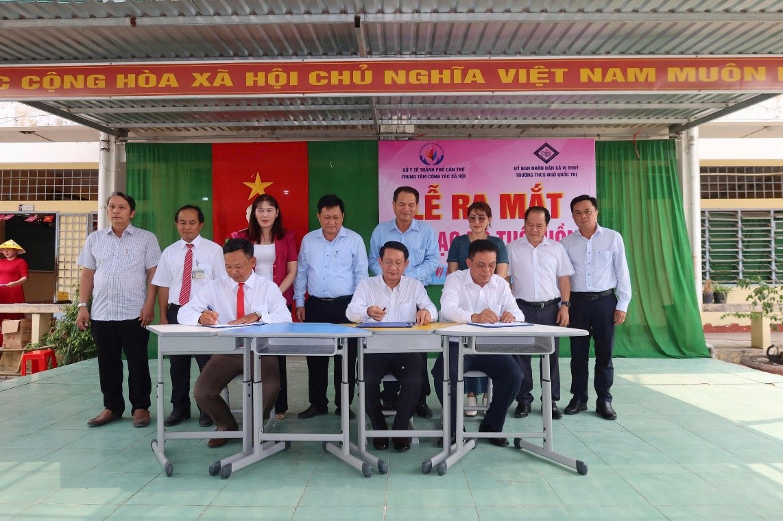 Hình 4. Đại diện Trung tâm Công tác xã hội, nhà trường và địa phương ký kết phối hợp triển khai mô hình Câu lạc bộ Tuổi hồng.