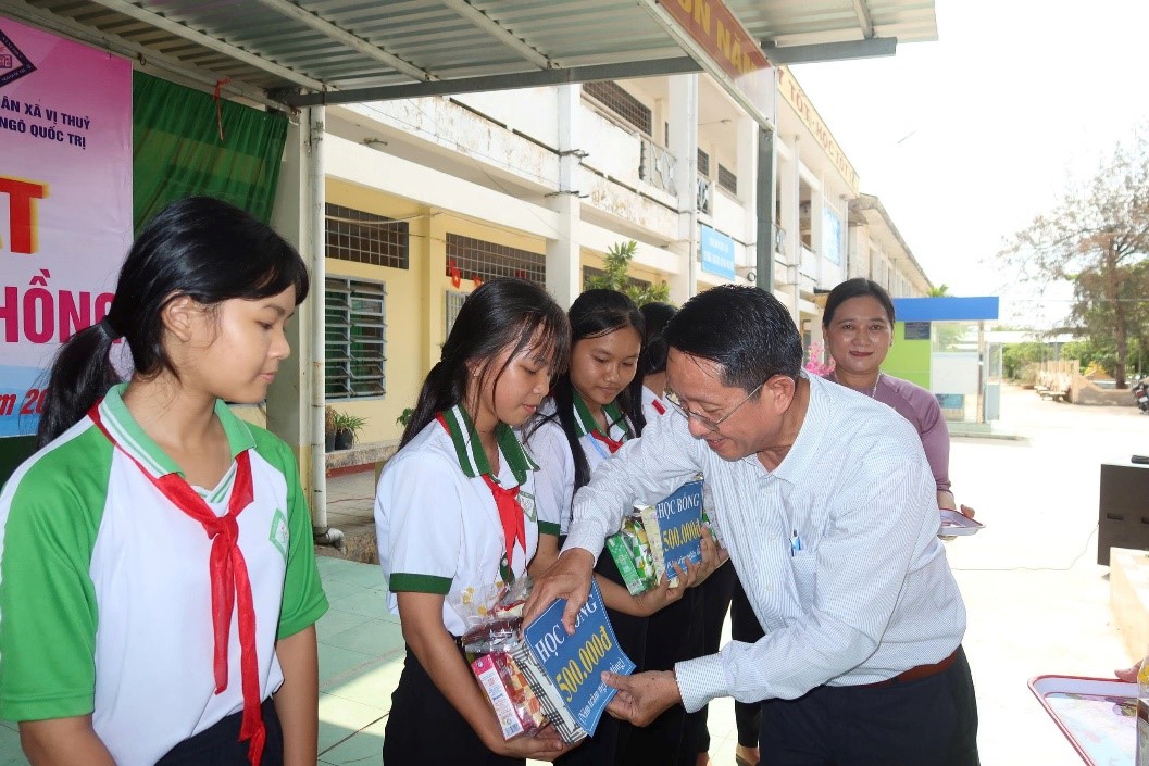 Hình 3. Trao học bổng và quà cho hội viên tham gia Câu lạc bộ Tuổi hồng tại Trường THCS Ngô Quốc Trị.